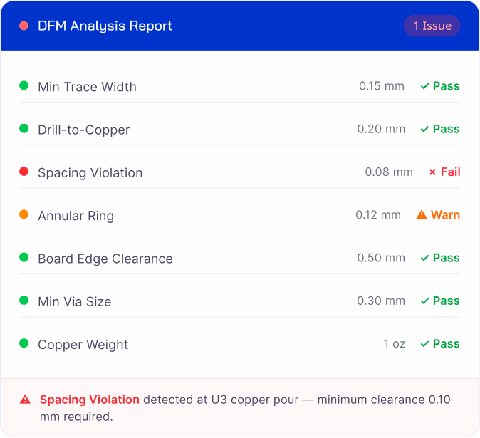Prototype and iterate PCBs faster with instant fabrication insights. Identify design issues early so you can iterate without delay.